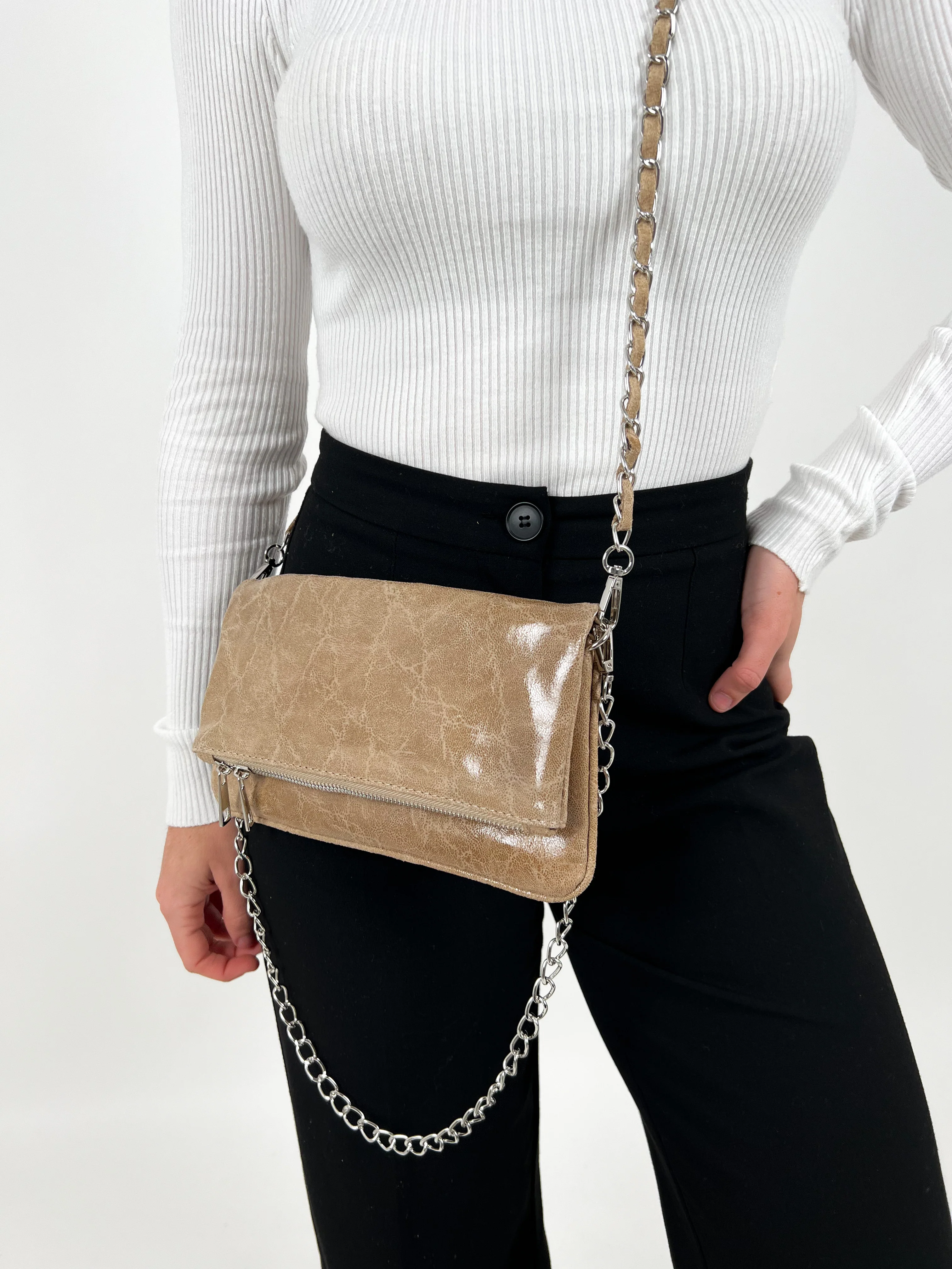 Bolso piel cadenas brillo beige
