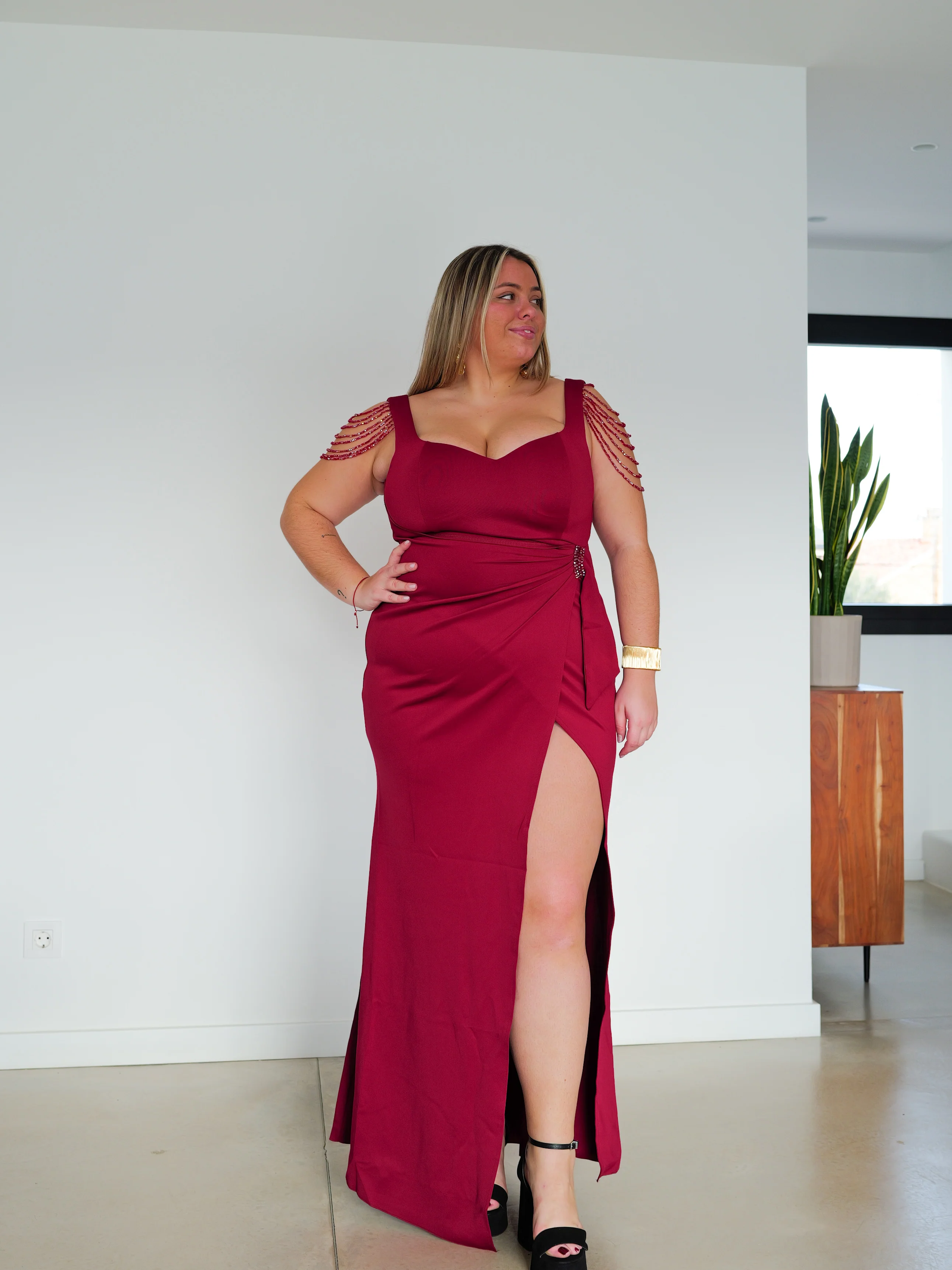 Vestido largo detalles hombros burdeos